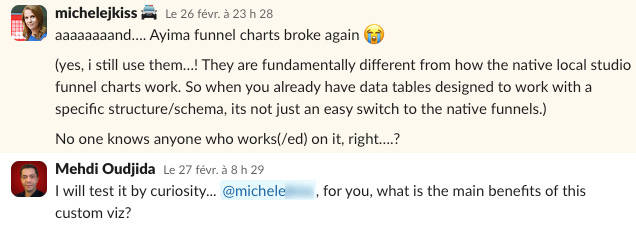 A few weeks ago, I learned through a discussion with Michele Kiss on #measure Slack channel (the place to be if you want to join an amazing community of analytics practitioners helping each other - end of the promo moment) that a custom funnel chart visualization created by the Ayima agency had been decommissioned.