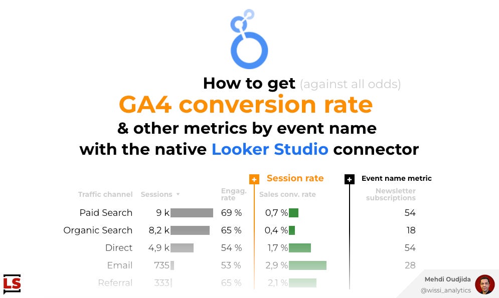 April 7, 2023 - How to insert your conversion rate & other event metrics from Google Analytics 4 with the native Looker Studio connector - Read the article