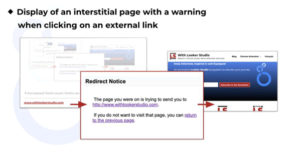 Interstitial alert when clicking on an external links. I would be nice for the future, to switch this feature as optional and based on a governance decisions, and not automatic for all links.Scorecard for dimensions