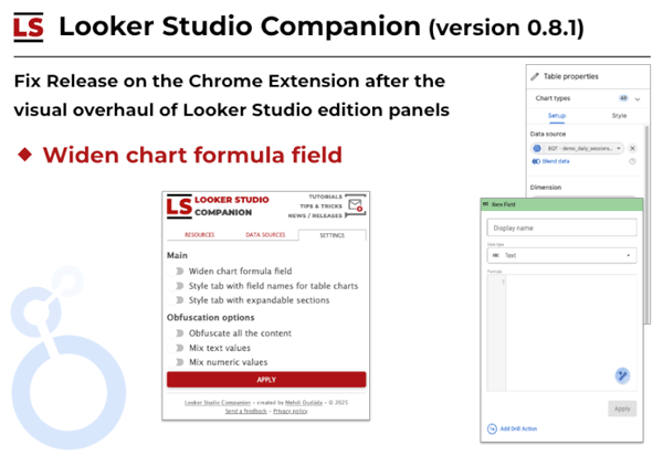 After the release mentioned above, I had to update the Looker Studio Companion to be compatible with the new design. Few minor fixes were necessary to retrieve all the features of settings.