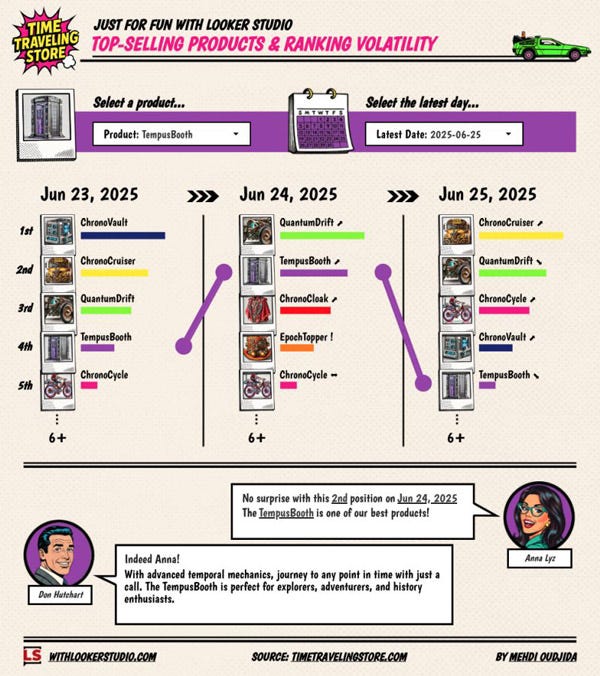 As always, it's a mix of business thinking, data modeling, Looker Studio hacks, and visual design inspiration. It was super fun to design it. Don't tell me you don't like time traveling, pop art comics and interactive ranking visualization.