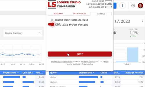 The release of a new feature for the Looker Studio companion, the Chrome extension: Obfuscation of content